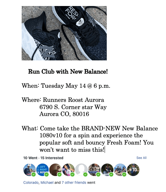 The assignment that asked for us to make social media examples was the one I decided to skip in the mindst of transitioning all five of my classes to an online setting. Therefore I spent a good chunk of time making some for this portion of the assignment. Two of my chosen social media channels were Facebook and Instagram. Below you will find an example for each and they will be promoting a run club event!